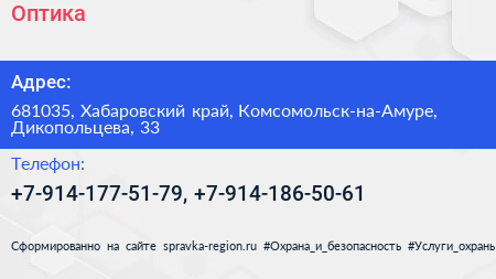 Оптика+ по адресу 681035, Хабаровский край, Комсомольск-на-Амуре, Дикопольцева, 33 в дальнейшем Организация, размещена в следующих категориях: