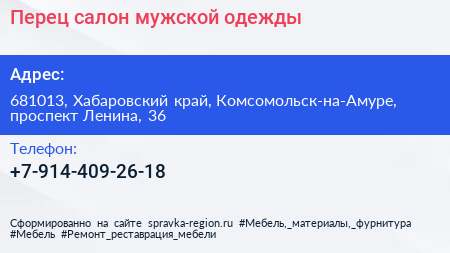 Перец, салон мужской одежды по адресу 681013, Хабаровский край, Комсомольск-на-Амуре, проспект Ленина, 36 в дальнейшем Организация, размещена в следующих категориях: