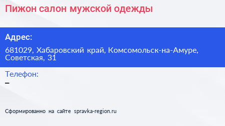 Пижон, салон мужской одежды по адресу 681029, Хабаровский край, Комсомольск-на-Амуре, Советская, 31 в дальнейшем Организация, размещена в следующих категориях: