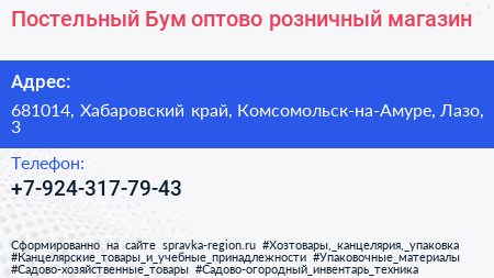 Постельный Бум, оптово-розничный магазин по адресу 681014, Хабаровский край, Комсомольск-на-Амуре, Лазо, 3 в дальнейшем Организация, размещена в следующих категориях: