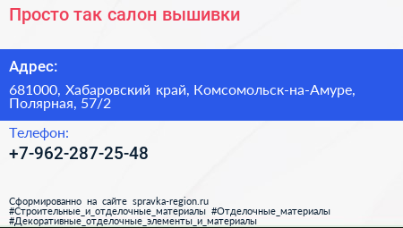 Просто так, салон вышивки по адресу 681000, Хабаровский край, Комсомольск-на-Амуре, Полярная, 57/2 в дальнейшем Организация, размещена в следующих категориях: