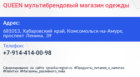 QUEEN, мультибрендовый магазин одежды по адресу 681013, Хабаровский край, Комсомольск-на-Амуре, проспект Ленина, 39 в дальнейшем Организация, размещена в следующих категориях: