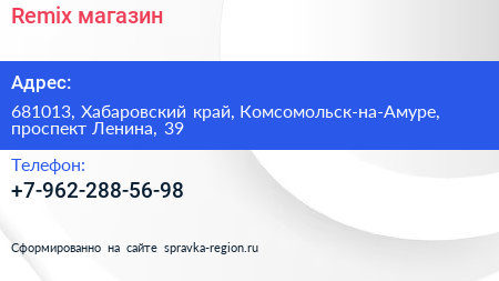 Remix, магазин по адресу 681013, Хабаровский край, Комсомольск-на-Амуре, проспект Ленина, 39 в дальнейшем Организация, размещена в следующих категориях: