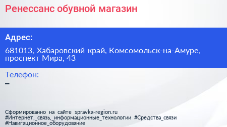 Ренессанс, обувной магазин по адресу 681013, Хабаровский край, Комсомольск-на-Амуре, проспект Мира, 43 в дальнейшем Организация, размещена в следующих категориях: