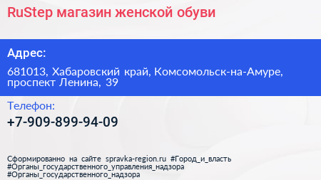 RuStep, магазин женской обуви по адресу 681013, Хабаровский край, Комсомольск-на-Амуре, проспект Ленина, 39 в дальнейшем Организация, размещена в следующих категориях: