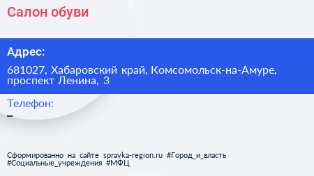Салон обуви по адресу 681027, Хабаровский край, Комсомольск-на-Амуре, проспект Ленина, 3 в дальнейшем Организация, размещена в следующих категориях: