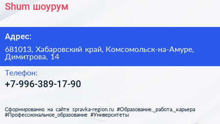 Shum, шоурум по адресу 681013, Хабаровский край, Комсомольск-на-Амуре, Димитрова, 14 в дальнейшем Организация, размещена в следующих категориях: