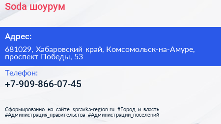 Soda, шоурум по адресу 681029, Хабаровский край, Комсомольск-на-Амуре, проспект Победы, 53 в дальнейшем Организация, размещена в следующих категориях: