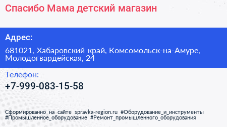 Спасибо Мама, детский магазин по адресу 681021, Хабаровский край, Комсомольск-на-Амуре, Молодогвардейская, 24 в дальнейшем Организация, размещена в следующих категориях: