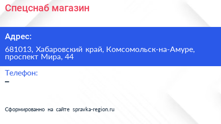 Спецснаб, магазин по адресу 681013, Хабаровский край, Комсомольск-на-Амуре, проспект Мира, 44 в дальнейшем Организация, размещена в следующих категориях:
