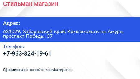 Стильман, магазин по адресу 681029, Хабаровский край, Комсомольск-на-Амуре, проспект Победы, 57 в дальнейшем Организация, размещена в следующих категориях: