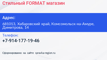 Стильный FORMAT, магазин по адресу 681013, Хабаровский край, Комсомольск-на-Амуре, Димитрова, 14 в дальнейшем Организация, размещена в следующих категориях: