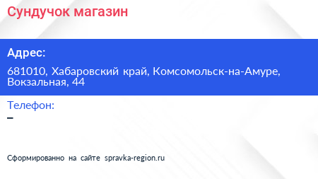 Сундучок, магазин по адресу 681010, Хабаровский край, Комсомольск-на-Амуре, Вокзальная, 44 в дальнейшем Организация, размещена в следующих категориях: