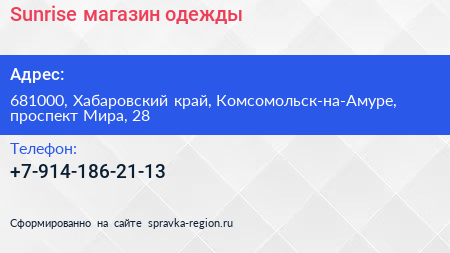 Sunrise, магазин одежды по адресу 681000, Хабаровский край, Комсомольск-на-Амуре, проспект Мира, 28 в дальнейшем Организация, размещена в следующих категориях: