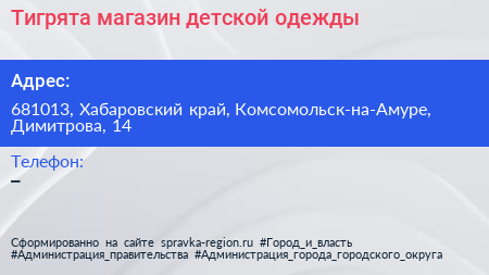 Тигрята, магазин детской одежды по адресу 681013, Хабаровский край, Комсомольск-на-Амуре, Димитрова, 14 в дальнейшем Организация, размещена в следующих категориях: