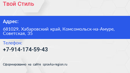 Твой Стиль по адресу 681029, Хабаровский край, Комсомольск-на-Амуре, Советская, 35 в дальнейшем Организация, размещена в следующих категориях:
