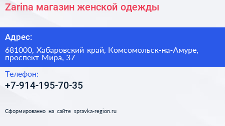 Zarina, магазин женской одежды по адресу 681000, Хабаровский край, Комсомольск-на-Амуре, проспект Мира, 37 в дальнейшем Организация, размещена в следующих категориях: