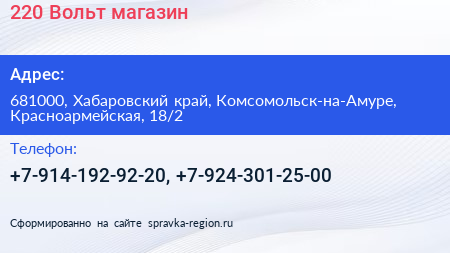220 Вольт, магазин по адресу 681000, Хабаровский край, Комсомольск-на-Амуре, Красноармейская, 18/2 в дальнейшем Организация, размещена в следующих категориях: