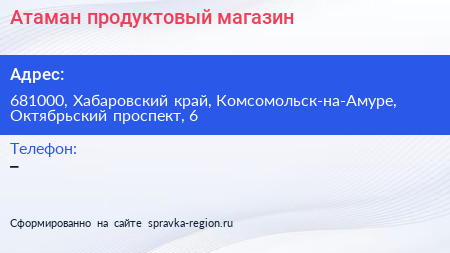 Атаман, продуктовый магазин по адресу 681000, Хабаровский край, Комсомольск-на-Амуре, Октябрьский проспект, 6 в дальнейшем Организация, размещена в следующих категориях: