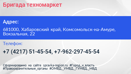 Бригада, техномаркет по адресу 681000, Хабаровский край, Комсомольск-на-Амуре, Вокзальная, 22 в дальнейшем Организация, размещена в следующих категориях: