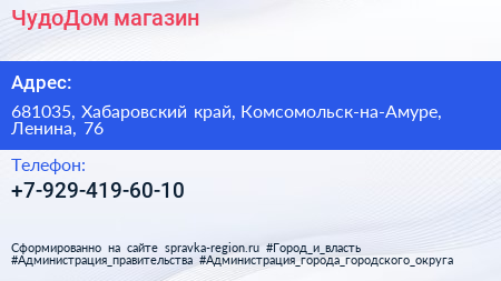 ЧудоДом, магазин по адресу 681035, Хабаровский край, Комсомольск-на-Амуре, Ленина, 76 в дальнейшем Организация, размещена в следующих категориях: