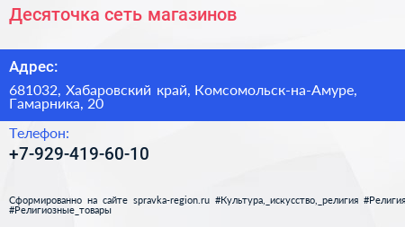 Десяточка, сеть магазинов по адресу 681032, Хабаровский край, Комсомольск-на-Амуре, Гамарника, 20 в дальнейшем Организация, размещена в следующих категориях:
