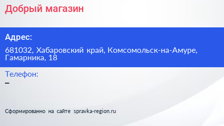 Добрый, магазин по адресу 681032, Хабаровский край, Комсомольск-на-Амуре, Гамарника, 18 в дальнейшем Организация, размещена в следующих категориях: