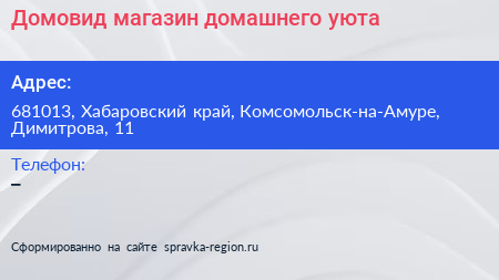 Домовид, магазин домашнего уюта по адресу 681013, Хабаровский край, Комсомольск-на-Амуре, Димитрова, 11 в дальнейшем Организация, размещена в следующих категориях: