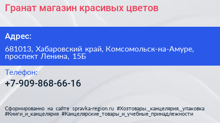 Гранат, магазин красивых цветов по адресу 681013, Хабаровский край, Комсомольск-на-Амуре, проспект Ленина, 15Б в дальнейшем Организация, размещена в следующих категориях: