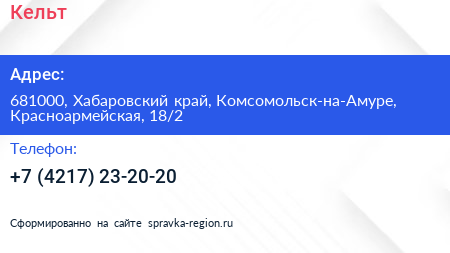Кельт по адресу 681000, Хабаровский край, Комсомольск-на-Амуре, Красноармейская, 18/2 в дальнейшем Организация, размещена в следующих категориях: