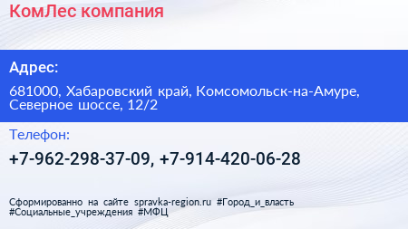 КомЛес, компания по адресу 681000, Хабаровский край, Комсомольск-на-Амуре, Северное шоссе, 12/2 в дальнейшем Организация, размещена в следующих категориях: