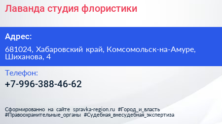 Лаванда, студия флористики по адресу 681024, Хабаровский край, Комсомольск-на-Амуре, Шиханова, 4 в дальнейшем Организация, размещена в следующих категориях: