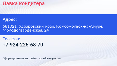 Лавка кондитера по адресу 681021, Хабаровский край, Комсомольск-на-Амуре, Молодогвардейская, 24 в дальнейшем Организация, размещена в следующих категориях: