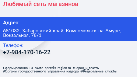 Любимый, сеть магазинов по адресу 681032, Хабаровский край, Комсомольск-на-Амуре, Вокзальная, 78/1 в дальнейшем Организация, размещена в следующих категориях: