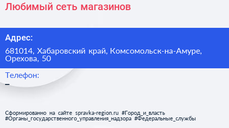 Любимый, сеть магазинов по адресу 681014, Хабаровский край, Комсомольск-на-Амуре, Орехова, 50 в дальнейшем Организация, размещена в следующих категориях:
