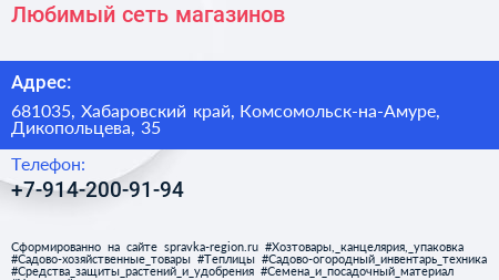 Любимый, сеть магазинов по адресу 681035, Хабаровский край, Комсомольск-на-Амуре, Дикопольцева, 35 в дальнейшем Организация, размещена в следующих категориях:
