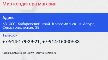Мир кондитера, магазин по адресу 681000, Хабаровский край, Комсомольск-на-Амуре, Севастопольская, 38 в дальнейшем Организация, размещена в следующих категориях: