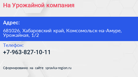 На Урожайной, компания по адресу 681026, Хабаровский край, Комсомольск-на-Амуре, Урожайная, 1/2 в дальнейшем Организация, размещена в следующих категориях: