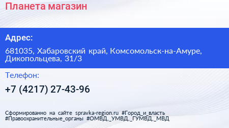 Планета, магазин по адресу 681035, Хабаровский край, Комсомольск-на-Амуре, Дикопольцева, 31/3 в дальнейшем Организация, размещена в следующих категориях:
