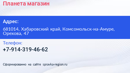 Планета, магазин по адресу 681014, Хабаровский край, Комсомольск-на-Амуре, Орехова, 47 в дальнейшем Организация, размещена в следующих категориях: