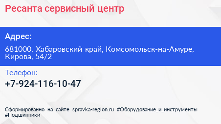 Ресанта, сервисный центр по адресу 681000, Хабаровский край, Комсомольск-на-Амуре, Кирова, 54/2 в дальнейшем Организация, размещена в следующих категориях:
