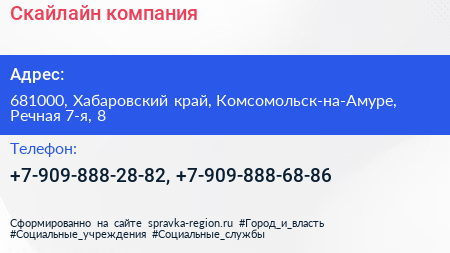 Скайлайн, компания по адресу 681000, Хабаровский край, Комсомольск-на-Амуре, Речная 7-я, 8 в дальнейшем Организация, размещена в следующих категориях: