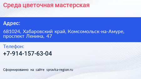 Среда, цветочная мастерская по адресу 681024, Хабаровский край, Комсомольск-на-Амуре, проспект Ленина, 47 в дальнейшем Организация, размещена в следующих категориях: