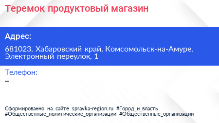 Теремок, продуктовый магазин по адресу 681023, Хабаровский край, Комсомольск-на-Амуре, Электронный переулок, 1 в дальнейшем Организация, размещена в следующих категориях: