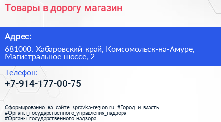 Товары в дорогу, магазин по адресу 681000, Хабаровский край, Комсомольск-на-Амуре, Магистральное шоссе, 2 в дальнейшем Организация, размещена в следующих категориях: