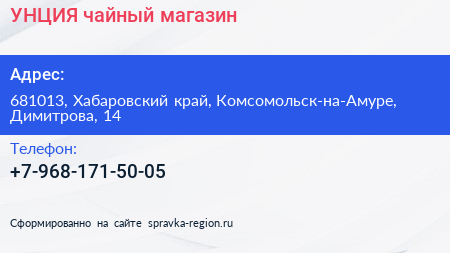 УНЦИЯ, чайный магазин по адресу 681013, Хабаровский край, Комсомольск-на-Амуре, Димитрова, 14 в дальнейшем Организация, размещена в следующих категориях: