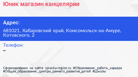Юник, магазин канцелярии по адресу 681021, Хабаровский край, Комсомольск-на-Амуре, Котовского, 2 в дальнейшем Организация, размещена в следующих категориях: