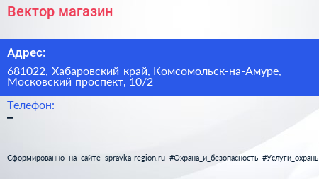 Вектор, магазин по адресу 681022, Хабаровский край, Комсомольск-на-Амуре, Московский проспект, 10/2 в дальнейшем Организация, размещена в следующих категориях: