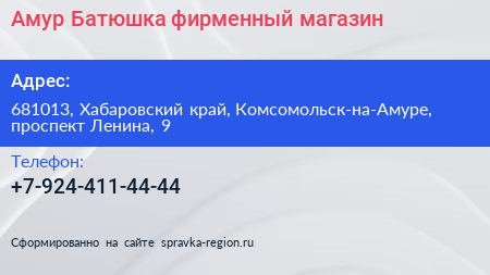 Амур-Батюшка, фирменный магазин по адресу 681013, Хабаровский край, Комсомольск-на-Амуре, проспект Ленина, 9 в дальнейшем Организация, размещена в следующих категориях: