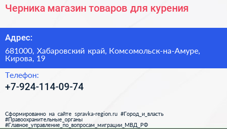 Черника, магазин товаров для курения по адресу 681000, Хабаровский край, Комсомольск-на-Амуре, Кирова, 19 в дальнейшем Организация, размещена в следующих категориях:
